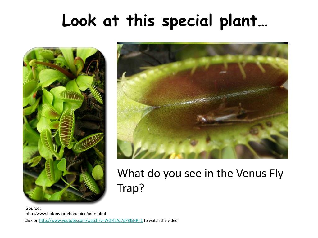 Source: http://www.botany.org/bsa/misc/carn.html Look at this special plant… What do you see in the Venus Fly Trap? Click on http://www.youtube.com/watch?v=Wdr4aAz7pP8&NR=1 to watch the video.
