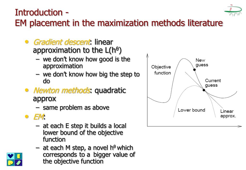 Introduction - EM placement in the maximization methods literature • Gradient descent: linear approximation to the L(hθ) • we don’t know how good is the approximation • we don’t know how big the step to do • Newton methods: quadratic approx • same problem as above • EM: • at each E step it builds a local lower bound of the objective function • at each M step, a novel hθwhich correspondsto a bigger value of the objective function