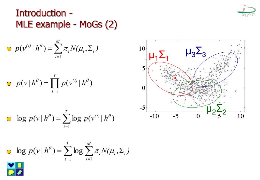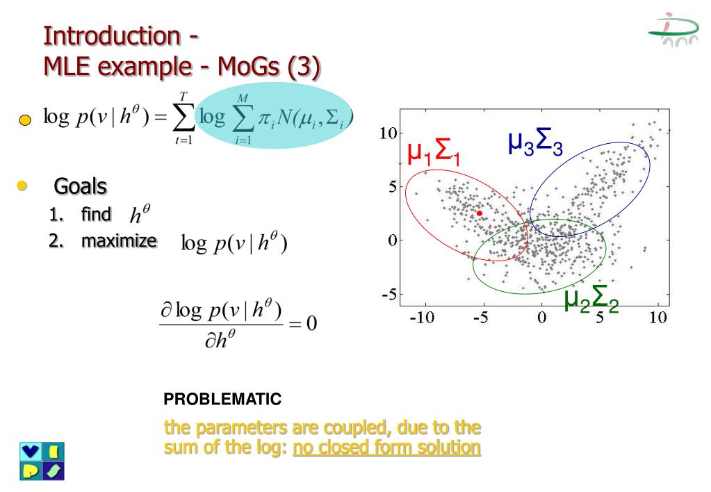 Introduction - MLE example - MoGs (3) • Goals • find • maximize μ3Σ3 μ1Σ1 μ2Σ2 PROBLEMATIC the parameters are coupled, due to the sum of the log: no closed form solution