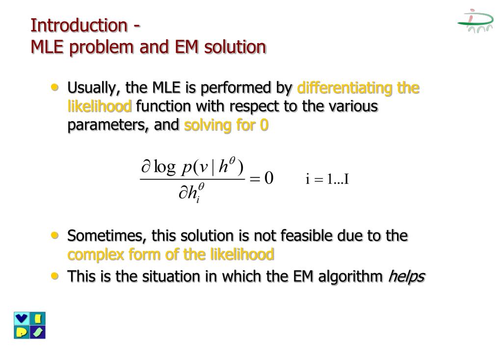 Introduction - MLE problem and EM solution • Usually, the MLE is performed by differentiating the likelihood function with respect to the various parameters, and solving for 0 • Sometimes, this solution is not feasible due to the complex form of the likelihood • This is the situation in which the EM algorithm helps