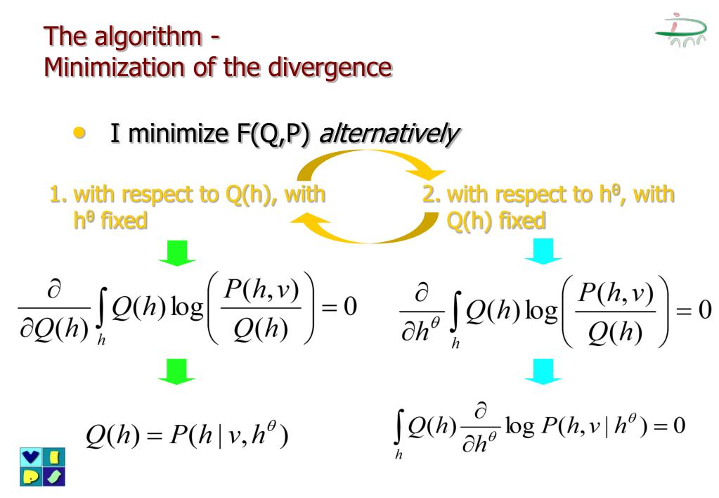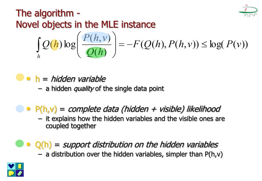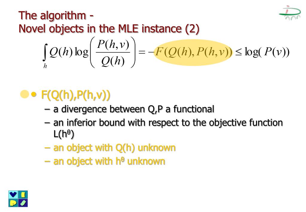 The algorithm - Novel objects in the MLE instance (2) • F(Q(h),P(h,v)) • a divergence between Q,P a functional • an inferior bound with respect to the objective function L(hθ) • an object with Q(h) unknown • an object with hθ unknown