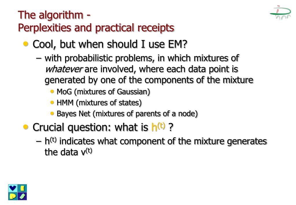 The algorithm - Perplexities and practical receipts • Cool, but when should I use EM? • with probabilistic problems, in which mixtures of whatever are involved, where each data point is generated by one of the components of the mixture • MoG (mixtures of Gaussian) • HMM (mixtures of states) • Bayes Net (mixtures of parents of a node) • Crucial question: what is h(t)? • h(t) indicates what component of the mixture generates the data v(t)