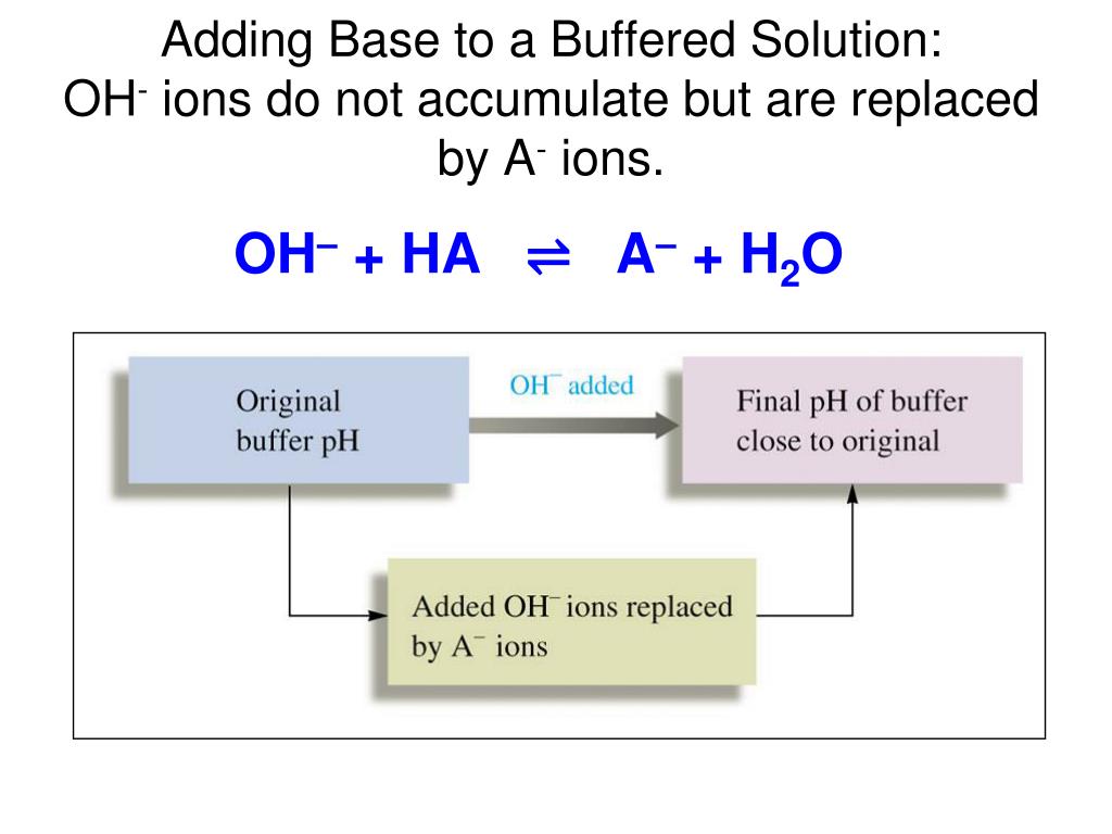 Adding Base to a Buffered Solution:OH- ions do not accumulate but are replaced by A- ions. OH– + HA ⇌ A– + H2O
