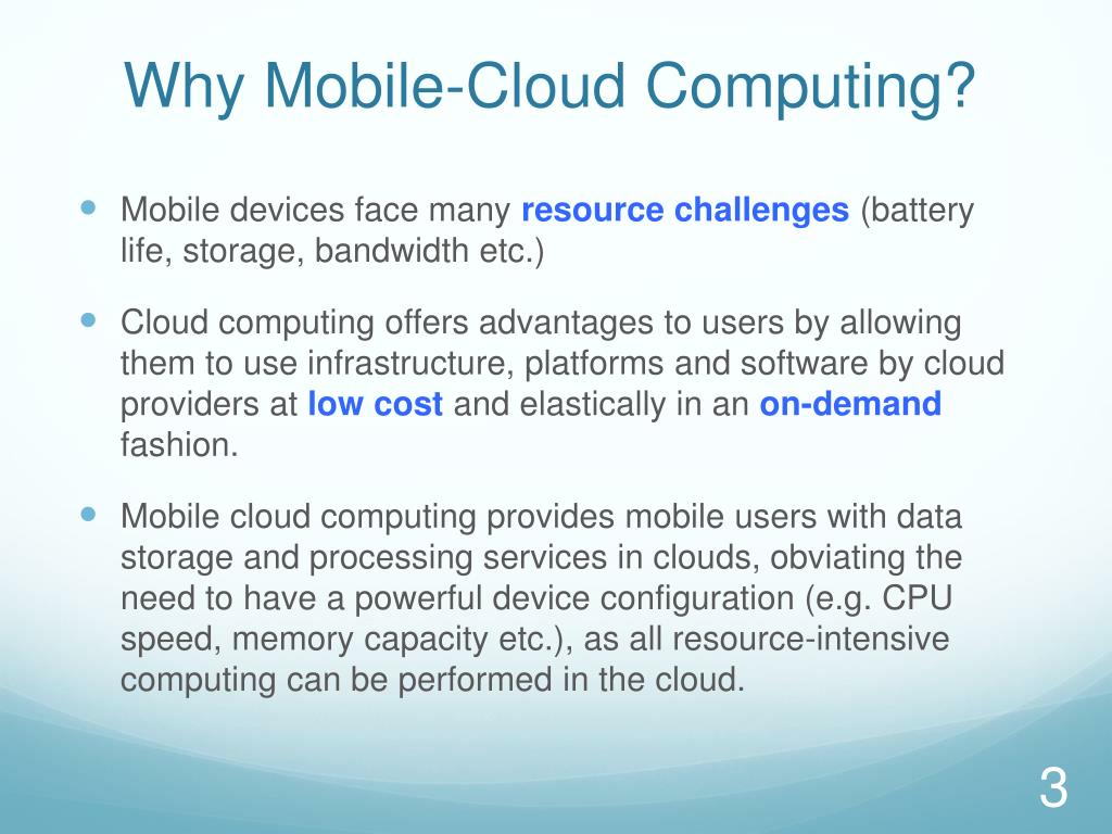 Why Mobile-Cloud Computing? • Mobile devices face many resource challenges (battery life, storage, bandwidth etc.) • Cloud computing offers advantages to users by allowing them to use infrastructure, platforms and software by cloud providers at low cost and elastically in an on-demandfashion. • Mobile cloud computing provides mobile users with data storage and processing services in clouds, obviating the need to have a powerful device configuration (e.g. CPU speed, memory capacity etc.), as all resource-intensive computing can be performed in the cloud.