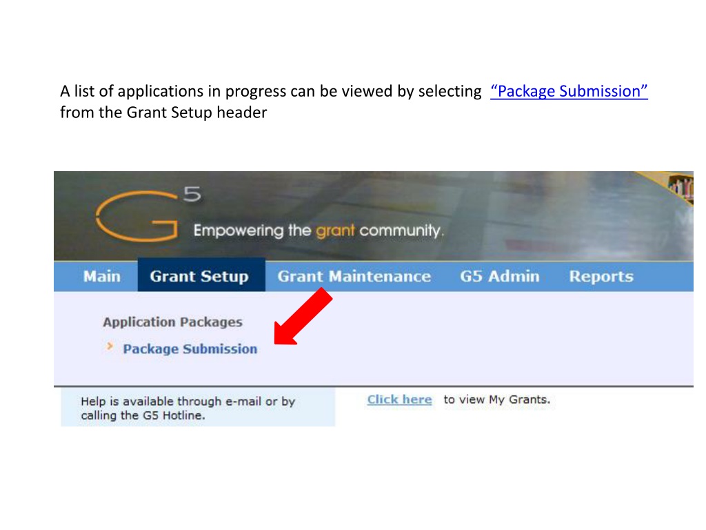 A list of applications in progress can be viewed by selecting “Package Submission” from the Grant Setup header