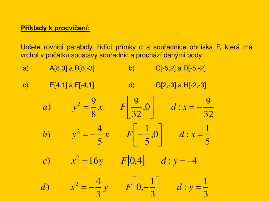 Příklady k procvičení: Určete rovnici paraboly, řídící přímky d a souřadnice ohniska F, která má vrchol v počátku soustavy souřadnic a prochází danými body: a) A[8,3] a B[8,-3] b) C[-5,2] a D[-5,-2] c) E[4,1] a F[-4,1] d) G[2,-3] a H[-2,-3]