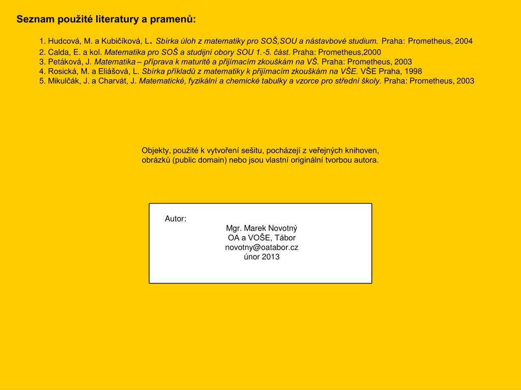 Seznam použité literatury a pramenů: 1. Hudcová, M. a Kubičíková, L. Sbírka úloh z matematiky pro SOŠ,SOU a nástavbové studium.Praha:Prometheus, 20042. Calda, E. a kol. Matematika pro SOŠ a studijní obory SOU 1.-5. část. Praha: Prometheus,2000 3. Petáková, J. Matematika – příprava k maturitě a přijímacím zkouškám na VŠ. Praha: Prometheus, 2003 4. Rosická, M. a Eliášová, L. Sbírka příkladů z matematiky k přijímacím zkouškám na VŠE. VŠE Praha, 1998 5. Mikulčák, J. a Charvát, J. Matematické, fyzikální a chemické tabulky a vzorce pro střední školy. Praha: Prometheus, 2003 Objekty, použité k vytvoření sešitu, pocházejí z veřejných knihoven, obrázků (public domain) nebo jsou vlastní originální tvorbou autora. Autor: Mgr. Marek Novotný OA a VOŠE, Tábor novotny@oatabor.cz únor 2013