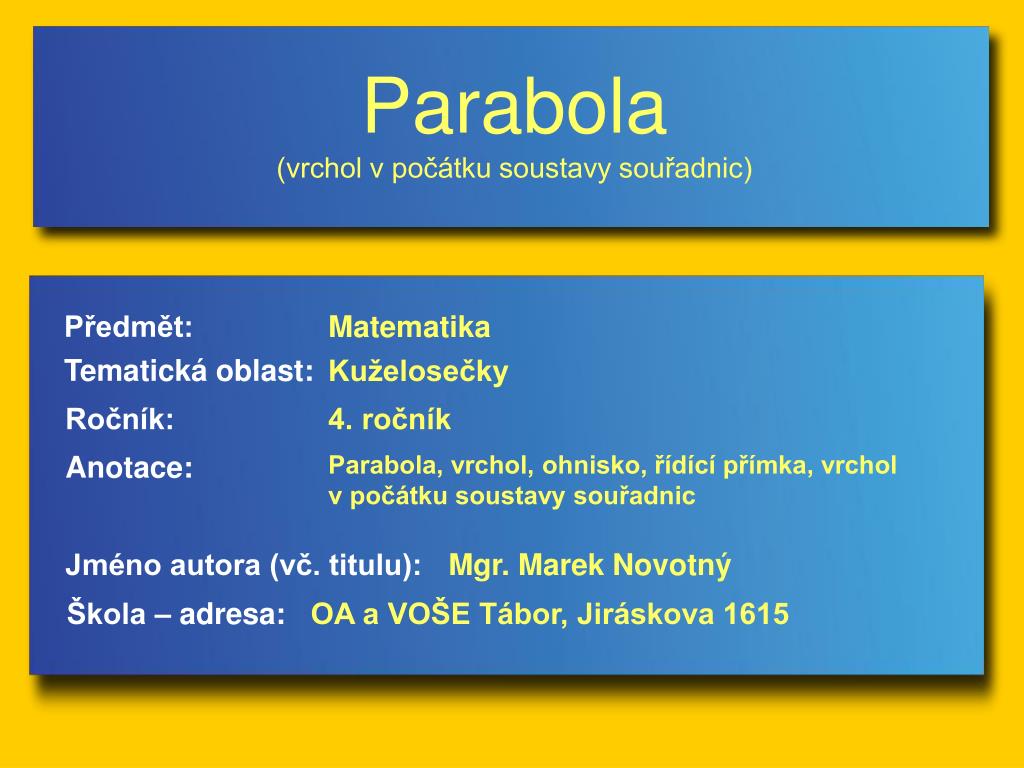 Parabola (vrchol v počátku soustavy souřadnic) Předmět: Matematika Tematická oblast: Kuželosečky Ročník: 4. ročník Anotace: Parabola, vrchol, ohnisko, řídící přímka, vrchol v počátku soustavy souřadnic Jméno autora (vč. titulu): Mgr. Marek Novotný Škola – adresa: OA a VOŠE Tábor, Jiráskova 1615