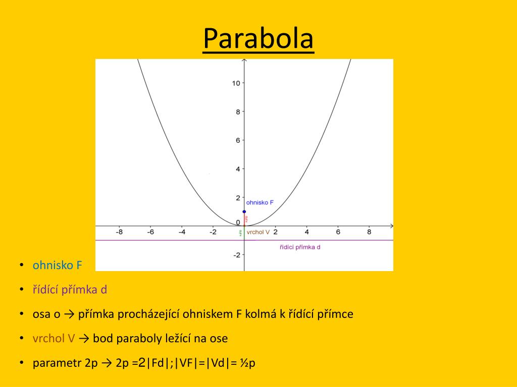 Parabola • ohnisko F • řídící přímka d • osa o → přímka procházející ohniskem F kolmá k řídící přímce • vrchol V → bod paraboly ležící na ose • parametr 2p → 2p =2|Fd|;|VF|=|Vd|= ½p