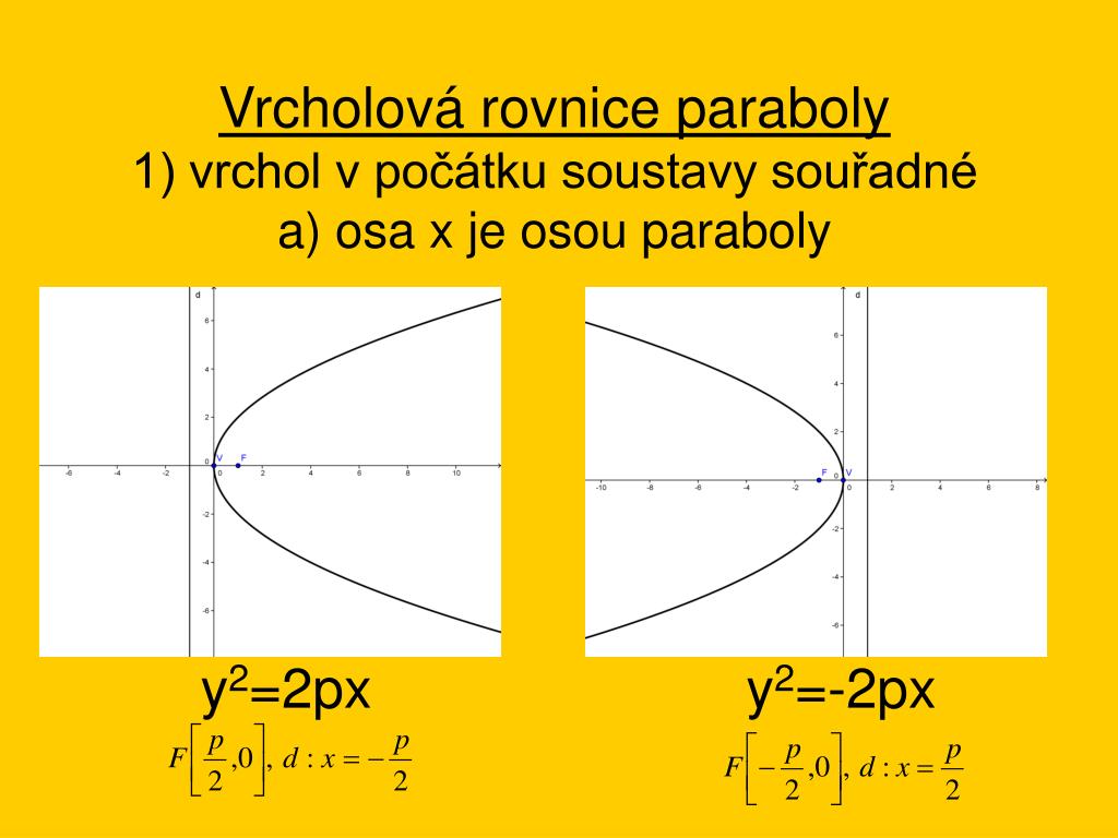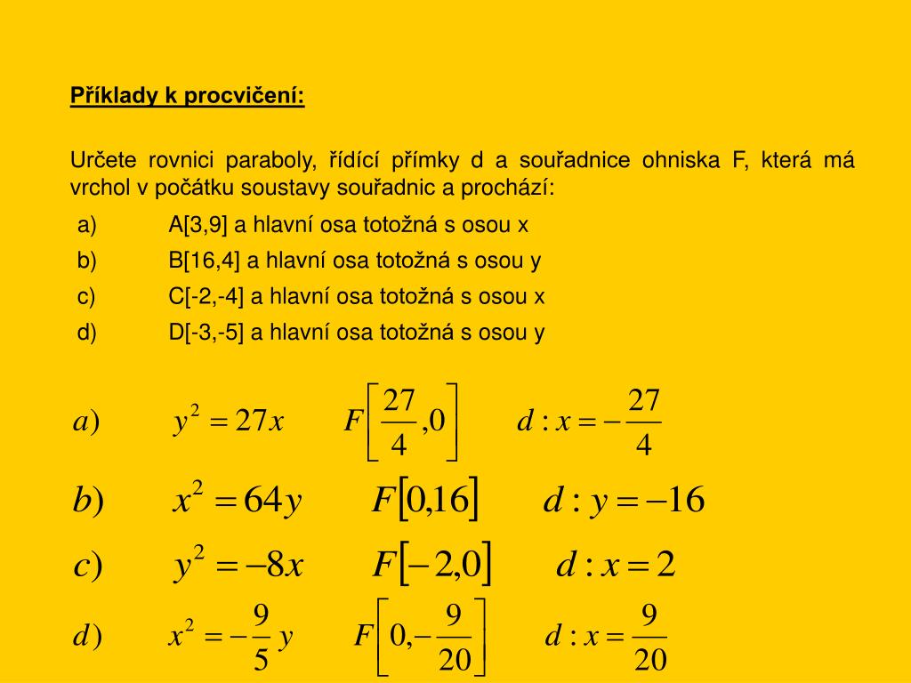 Příklady k procvičení: Určete rovnici paraboly, řídící přímky d a souřadnice ohniska F, která má vrchol v počátku soustavy souřadnic a prochází: a) A[3,9] a hlavní osa totožná s osou x b) B[16,4] a hlavní osa totožná s osou y c) C[-2,-4] a hlavní osa totožná s osou x d) D[-3,-5] a hlavní osa totožná s osou y