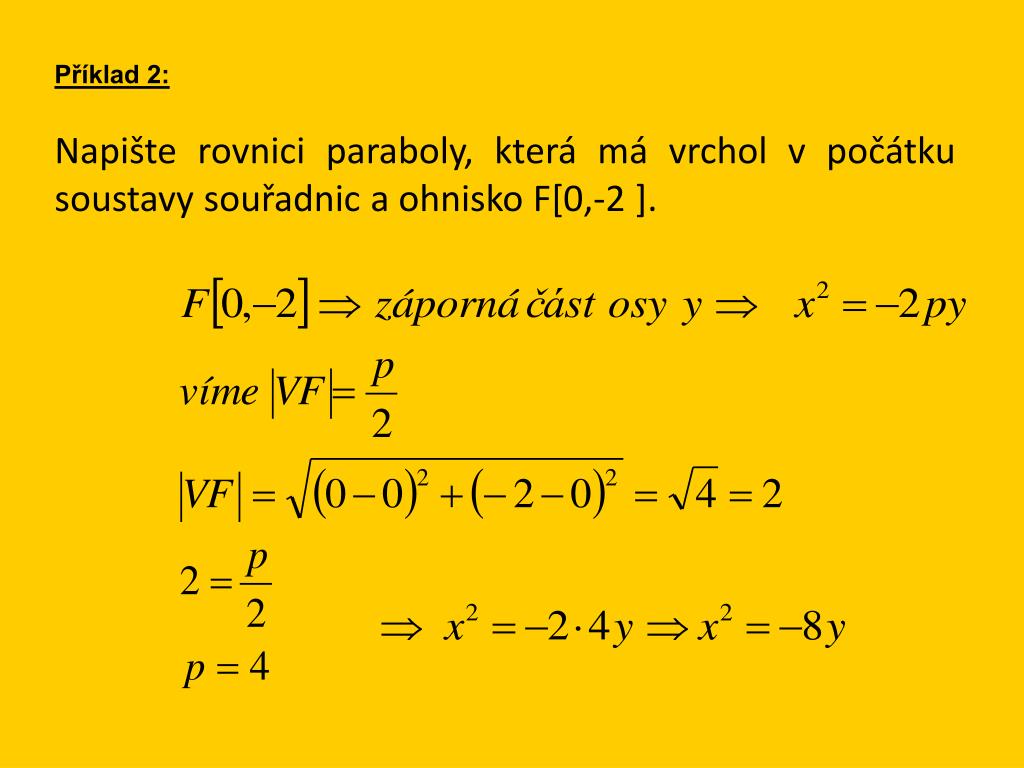 Příklad 2: Napište rovnici paraboly, která má vrchol v počátku soustavy souřadnic a ohnisko F[0,-2 ].