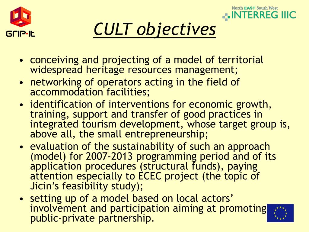 CULT objectives • conceiving and projecting of a model of territorial widespread heritage resources management; • networking of operators acting in the field of accommodation facilities; • identification of interventions for economic growth, training, support and transfer of good practices in integrated tourism development, whose target group is, above all, the small entrepreneurship; • evaluation of the sustainability of such an approach (model) for 2007-2013 programming period and of its application procedures (structural funds), paying attention especially to ECEC project (the topic of Jicin’s feasibility study); • setting up of a model based on local actors’ involvement and participation aiming at promoting public-private partnership.