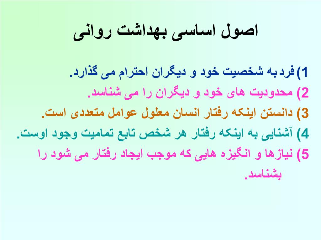 اصول اساسی بهداشت روانی 1)فردبه شخصيت خود و ديگران احترام می گذارد. 2) محدوديت های خود و ديگران را می شناسد. 3) دانستن اينکه رفتار انسان معلول عوامل متعددی است. 4) آشنايی به اينکه رفتار هر شخص تابع تماميت وجود اوست. 5) نيازها و انگيزه هايی که موجب ايجاد رفتار می شود را بشناسد.