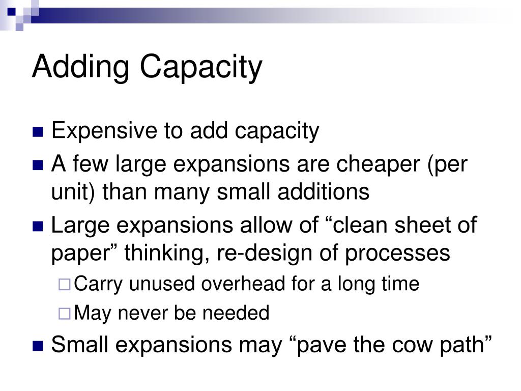 Adding Capacity • Expensive to add capacity • A few large expansions are cheaper (per unit) than many small additions • Large expansions allow of “clean sheet of paper” thinking, re-design of processes • Carry unused overhead for a long time • May never be needed • Small expansions may “pave the cow path”