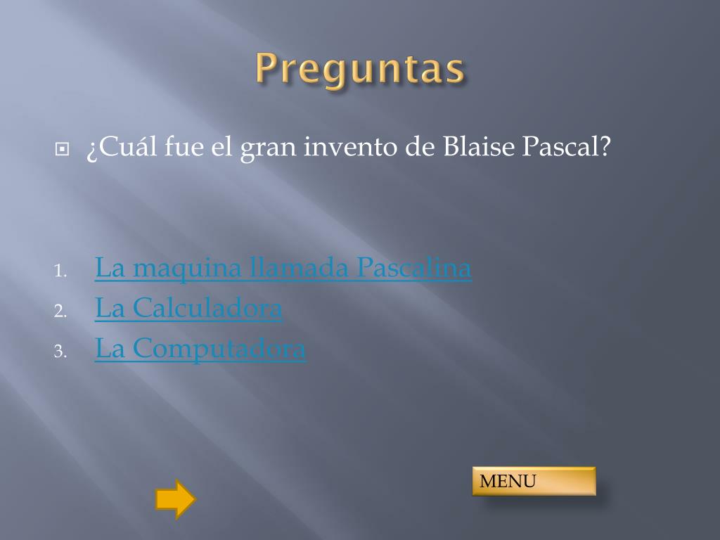 Preguntas • ¿Cuál fue el gran invento de Blaise Pascal? • La maquina llamada Pascalina • La Calculadora • La Computadora MENU