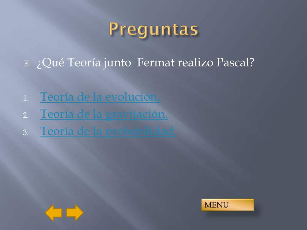 Preguntas • ¿Qué Teoría junto Fermat realizo Pascal? • Teoría de la evolución. • Teoría de la gravitación. • Teoría de la probabilidad. MENU
