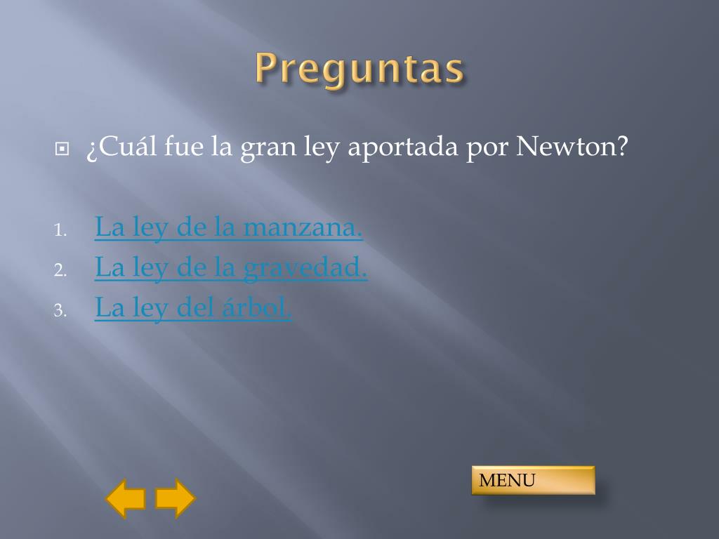 Preguntas • ¿Cuál fue la gran ley aportada por Newton? • La ley de la manzana. • La ley de la gravedad. • La ley del árbol. MENU