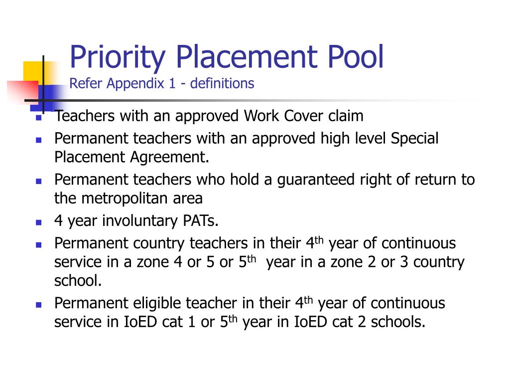Priority Placement Pool Refer Appendix 1 - definitions • Teachers with an approved Work Cover claim • Permanent teachers with an approved high level Special Placement Agreement. • Permanent teachers who hold a guaranteed right of return to the metropolitan area • 4 year involuntary PATs. • Permanent country teachers in their 4th year of continuous service in a zone 4 or 5 or 5th year in a zone 2 or 3 country school. • Permanent eligible teacher in their 4th year of continuous service in IoED cat 1 or 5th year in IoED cat 2 schools.