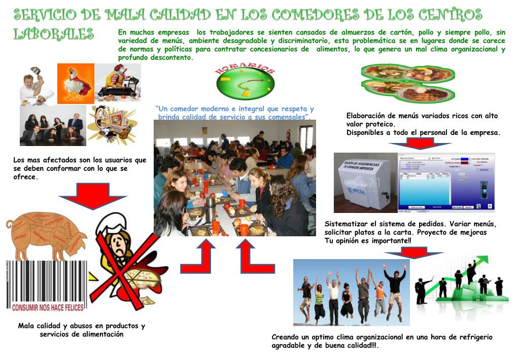 SERVICIO DE MALA CALIDAD EN LOS COMEDORES DE LOS CENTROS LABORALES En muchas empresas los trabajadores se sienten cansados de almuerzos de cartón, pollo y siempre pollo, sin variedad de menús, ambiente desagradable y discriminatorio, esta problemática se en lugares donde se carece de normas y políticas para contratar concesionarios de alimentos, lo que genera un mal clima organizacional y profundo descontento. “Un comedor moderno e integral que respeta y brinda calidad de servicio a sus comensales”. Elaboración de menús variados ricos con alto valor proteico. Disponibles a todo el personal de la empresa. Los mas afectados son los usuarios que se deben conformar con lo que se ofrece. Sistematizar el sistema de pedidos. Variar menús, solicitar platos a la carta. Proyecto de mejoras Tu opinión es importante!! Mala calidad y abusos en productos y servicios de alimentación Creando un optimo clima organizacional en una hora de refrigerio agradable y de buena calidad!!!.