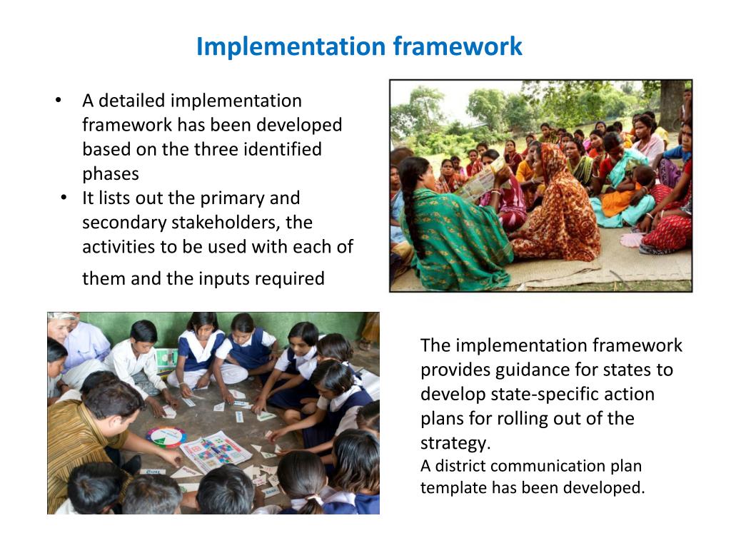 Implementation framework • A detailed implementation framework has been developed based on the three identified phases • It lists out the primary and secondary stakeholders, the activities to be used with each of them and the inputs required The implementation framework provides guidance for states to develop state-specific action plans for rolling out of the strategy. A district communication plan template has been developed.