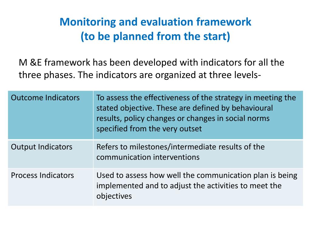Monitoring and evaluation framework (to be planned from the start) M &E framework has been developed with indicators for all the three phases. The indicators are organized at three levels-
