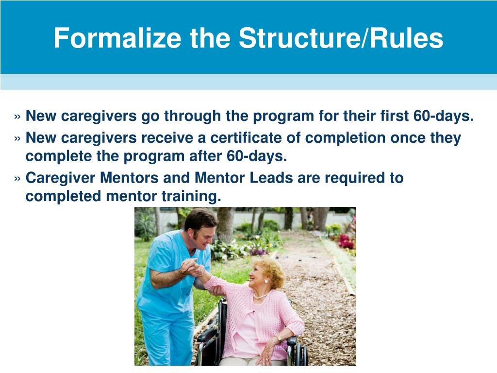 Formalize the Structure/Rules • New caregivers go through the program for their first 60-days. • New caregivers receive a certificate of completion once they complete the program after 60-days. • Caregiver Mentors and Mentor Leads are required to completed mentor training.