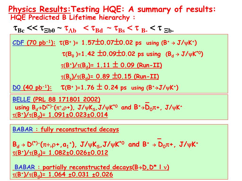 HQE Predicted B Lifetime hierarchy : tBc << tXb0 ~ tLb < tBd ~ tBs < t B- < t Xb- Physics Results:Testing HQE: A summary of results: • CDF (70 pb-1):t(B+)=1.570.070.02 ps using (B+ J/yK+) • t(B0)=1.42 0.090.02 ps using (Bd J/yK*0) • t(B+)/t(Bd)= 1.11 0.09 (Run-II) • t(Bs)/t(Bd)= 0.89 0.15 (Run-II) • D0 (40 pb-1):t(B+)=1.76 0.24ps using (B+J/yK+) BELLE (PRL 88 171801 2002) using BdD(*)-(p+,r+), J/yKS,J/yK*0 and B+D0p+, J/yK+ t(B+)/t(Bd)= 1.091±0.023±0.014 BABAR : fully reconstructed decays Bd D(*)-(p+,r+,a1+), J/yKS,J/yK*0 and B+D0p+, J/yK+ t(B+)/t(Bd)= 1.082±0.026±0.012 BABAR : partially reconstructed decays(BD,D* l n) t(B+)/t(Bd)= 1.064 ±0.031 ±0.026