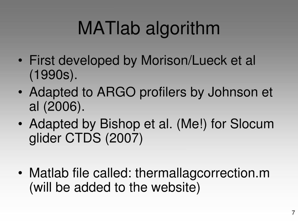 MATlab algorithm • First developed by Morison/Lueck et al (1990s). • Adapted to ARGO profilers by Johnson et al (2006). • Adapted by Bishop et al. (Me!) for Slocum glider CTDS (2007) • Matlab file called: thermallagcorrection.m (will be added to the website) 7