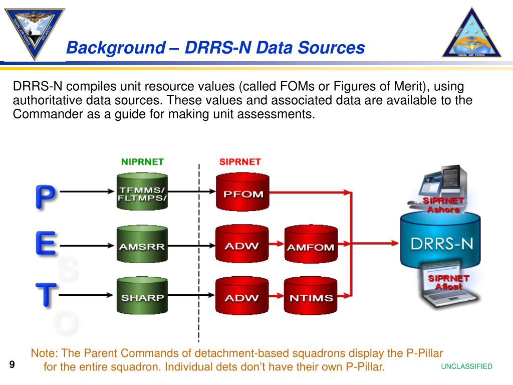 Background – DRRS-N Data Sources DRRS-N compiles unit resource values (called FOMs or Figures of Merit), using authoritative data sources. These values and associated data are available to the Commander as a guide for making unit assessments. Note: The Parent Commands of detachment-based squadrons display the P-Pillar for the entire squadron. Individual dets don’t have their own P-Pillar.