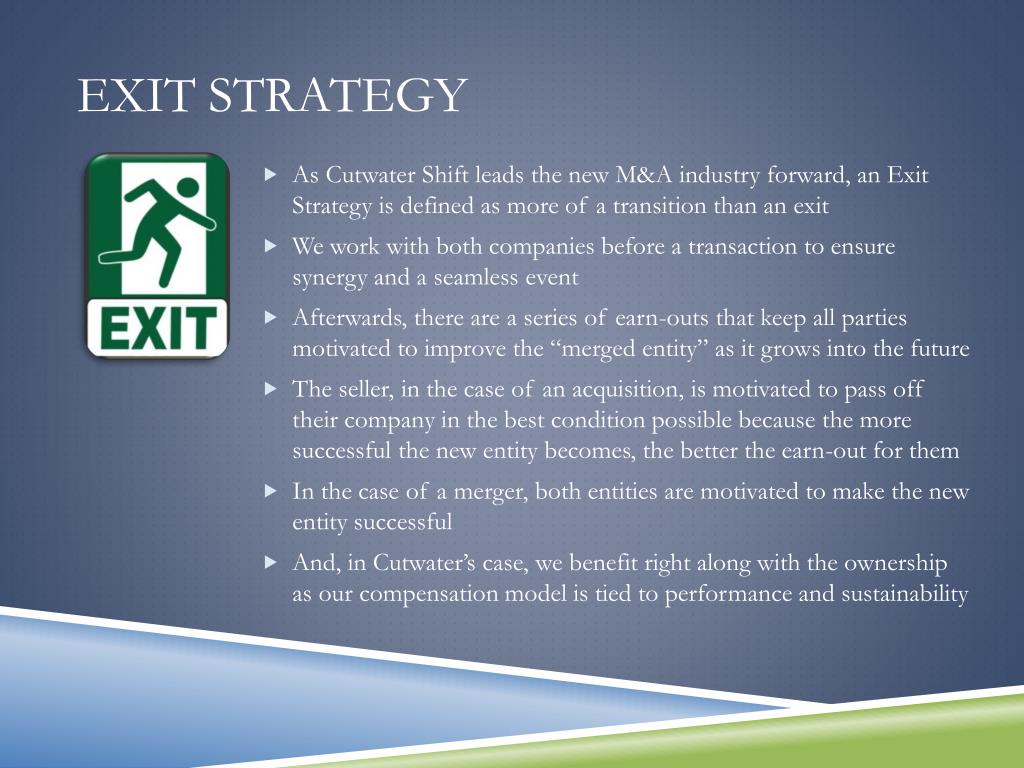 Exit Strategy • As Cutwater Shift leads the new M&A industry forward, an Exit Strategy is defined as more of a transition than an exit • We work with both companies before a transaction to ensure synergy and a seamless event • Afterwards, there are a series of earn-outs that keep all parties motivated to improve the “merged entity” as it grows into the future • The seller, in the case of an acquisition, is motivated to pass off their company in the best condition possible because the more successful the new entity becomes, the better the earn-out for them • In the case of a merger, both entities are motivated to make the new entity successful • And, in Cutwater’s case, we benefit right along with the ownership as our compensation model is tied to performance and sustainability