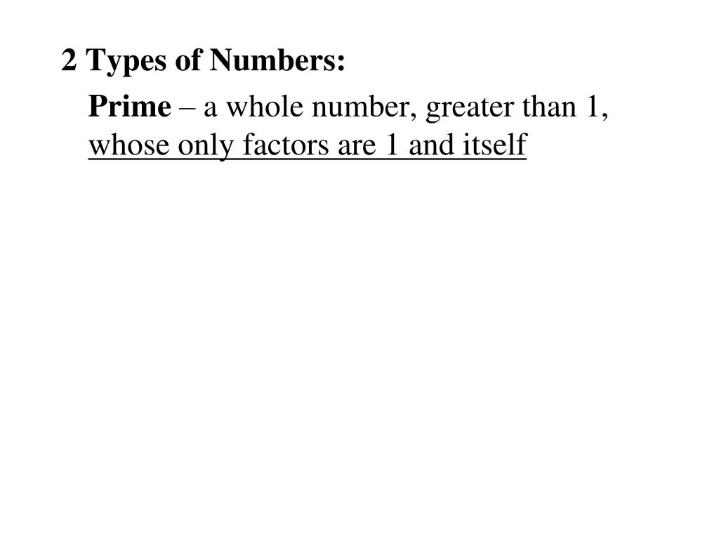 2 Types of Numbers: Prime – a whole number, greater than 1, whose only factors are 1 and itself