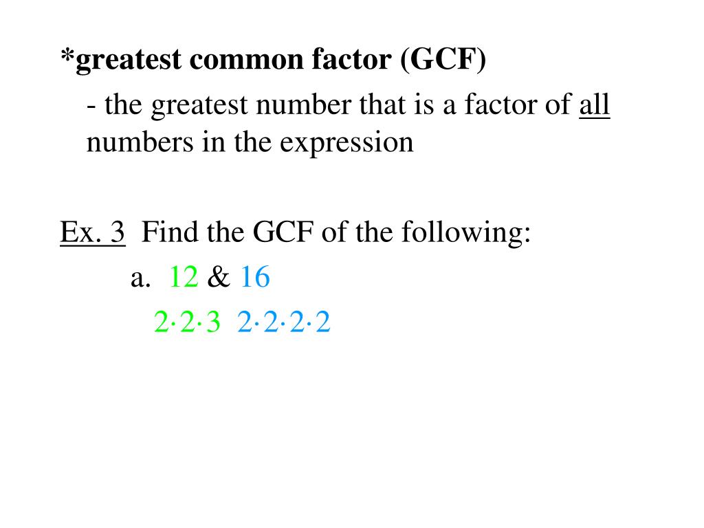 *greatest common factor (GCF) - the greatest number that is a factor of all numbers in the expression Ex. 3 Find the GCF of the following: a. 12 & 16