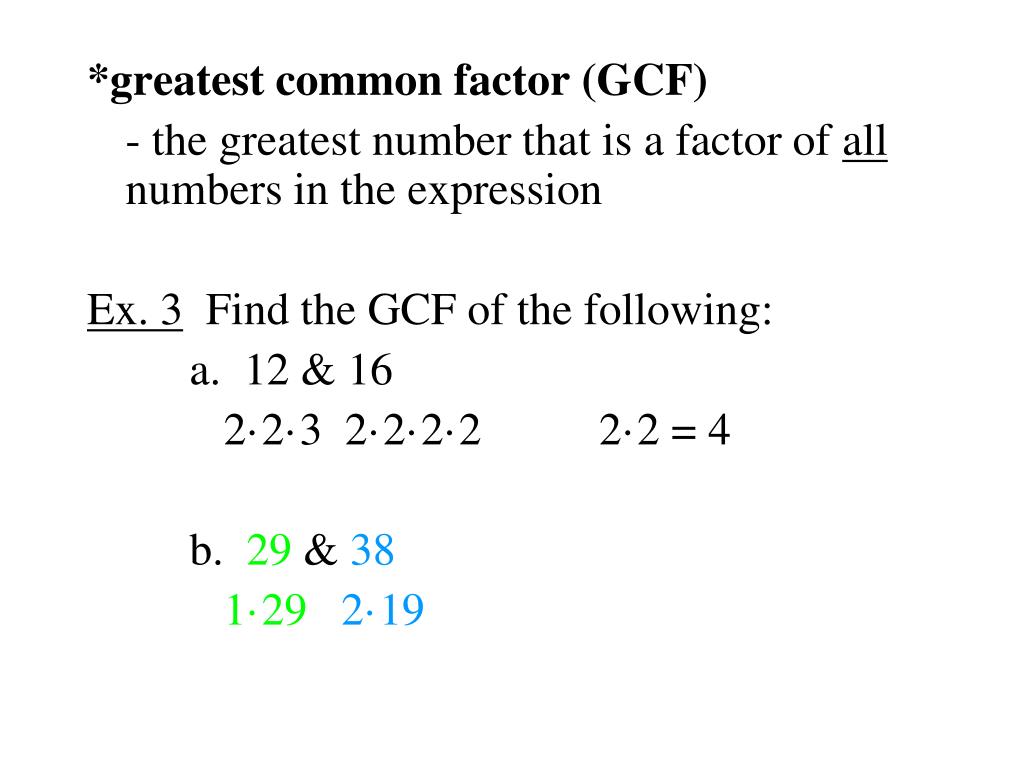*greatest common factor (GCF) - the greatest number that is a factor of all numbers in the expression Ex. 3 Find the GCF of the following: a. 12 & 16 2·2·3 2·2·2·2 2·2 = 4 b. 29 & 38 1·292·19