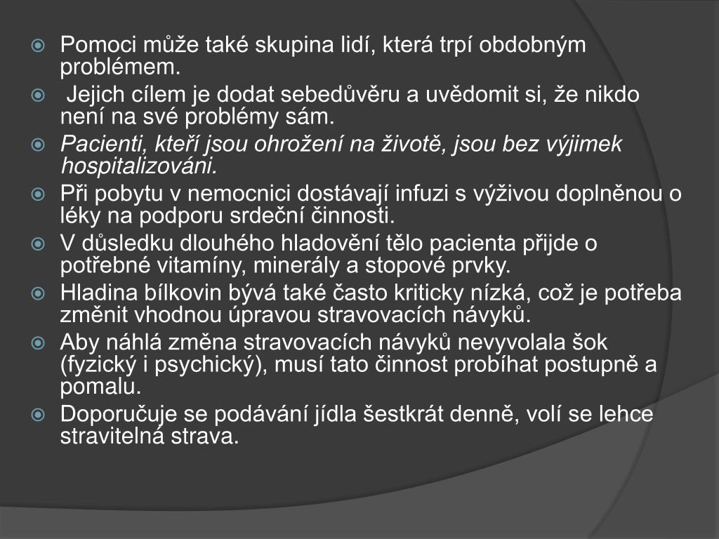 Pomoci může také skupina lidí, která trpí obdobným problémem. • Jejich cílem je dodat sebedůvěru a uvědomit si, že nikdo není na své problémy sám. • Pacienti, kteří jsou ohrožení na životě, jsou bez výjimek hospitalizováni. • Při pobytu v nemocnici dostávají infuzi s výživou doplněnou o léky na podporu srdeční činnosti. • V důsledku dlouhého hladovění tělo pacienta přijde o potřebné vitamíny, minerály a stopové prvky. • Hladina bílkovin bývá také často kriticky nízká, což je potřeba změnit vhodnou úpravou stravovacích návyků. • Aby náhlá změna stravovacích návyků nevyvolala šok (fyzický i psychický), musí tato činnost probíhat postupně a pomalu. • Doporučuje se podávání jídla šestkrát denně, volí se lehce stravitelná strava.