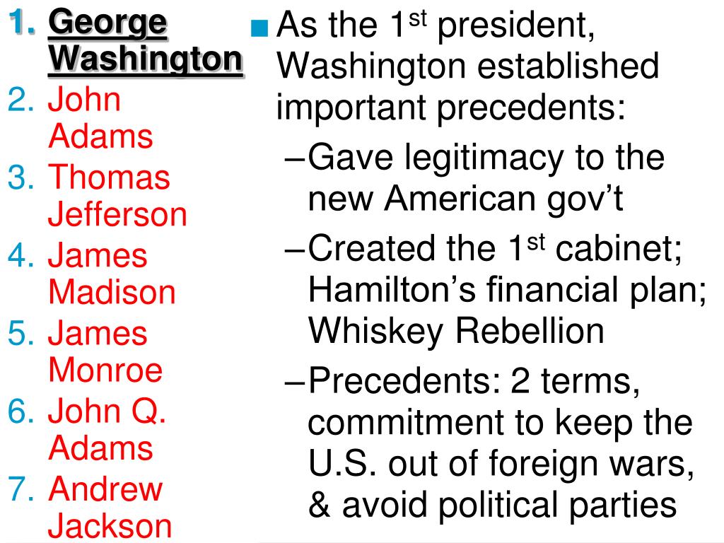George Washington John Adams Thomas Jefferson James Madison James Monroe John Q. Adams Andrew Jackson As the 1st president, Washington established important precedents: Gave legitimacy to the new American gov’t Created the 1st cabinet; Hamilton’s financial plan; Whiskey Rebellion Precedents: 2 terms, commitment to keep the U.S. out of foreign wars, & avoid political parties