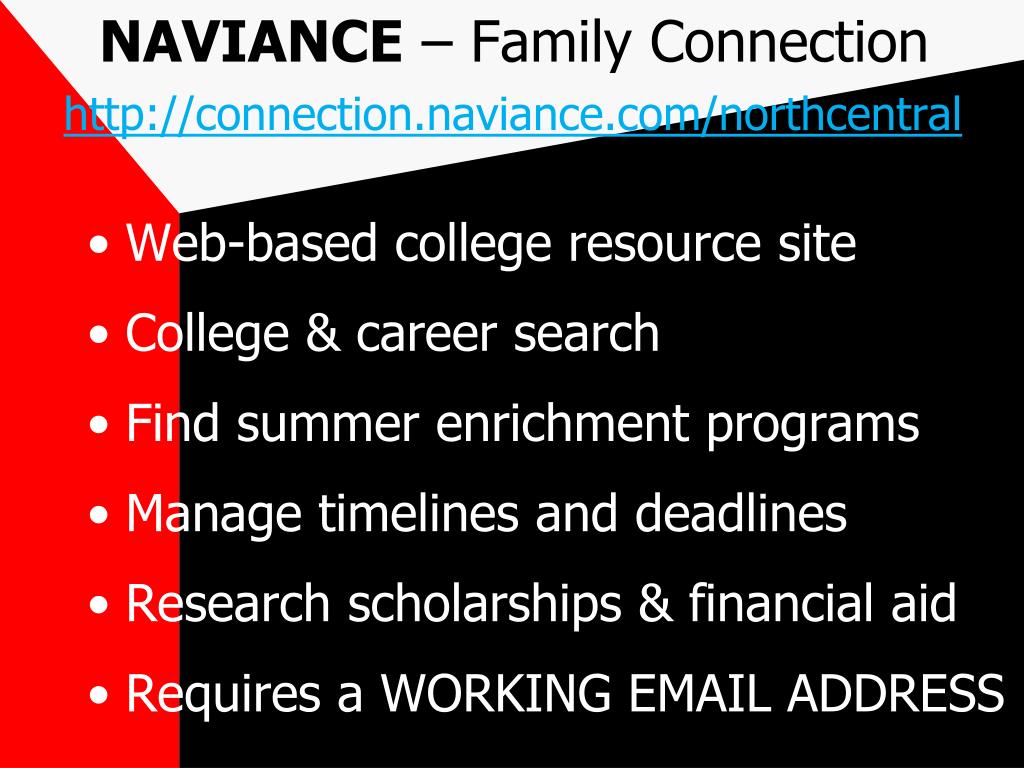 NAVIANCE– Family Connectionhttp://connection.naviance.com/northcentral • Web-based college resource site • College & career search • Find summer enrichment programs • Manage timelines and deadlines • Research scholarships & financial aid • Requires a WORKING EMAIL ADDRESS