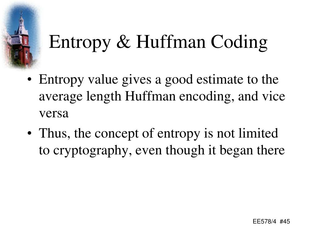 Entropy & Huffman Coding Entropy value gives a good estimate to the average length Huffman encoding, and vice versa Thus, the concept of entropy is not limited to cryptography, even though it began there