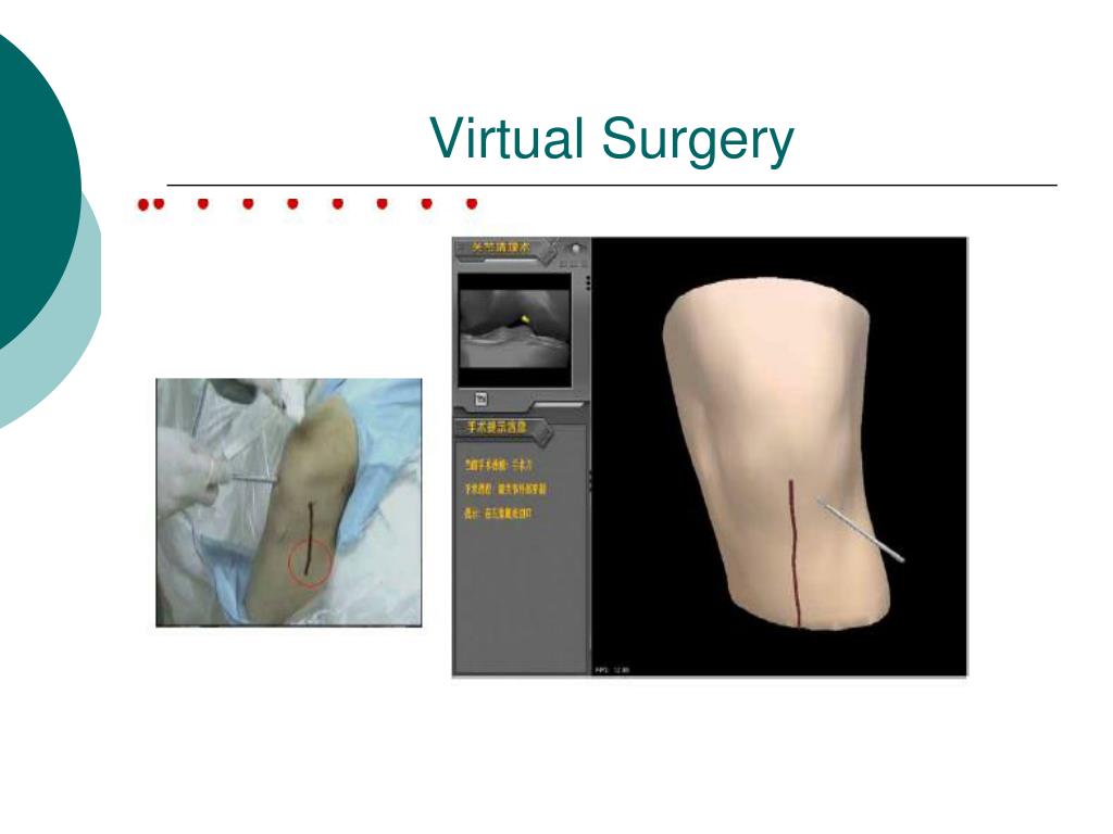 Applications in a hospital • Assist surgeon plan surgical operation or diagnose • Picture archiving system (PACS) • 將醫療系統中所有的影像,以數位化的方式儲存,並經由網路傳遞至同系統中,供使用者於遠側電腦螢幕閱讀影像並判讀。 • Telemedicine • Surgical simulation: Medical Visualization,Surgical augmented Reality, Medical-purpose robot, Surgery Simulation,Image Guided Surgery,Computer Aided Surgery • Estimate the location, size and shape of tumor