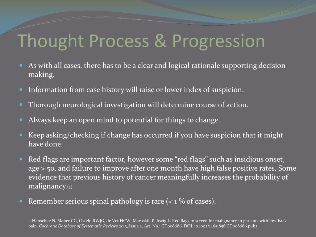 Thought Process & Progression • As with all cases, there has to be a clear and logical rationale supporting decision making. • Information from case history will raise or lower index of suspicion. • Thorough neurological investigation will determine course of action. • Always keep an open mind to potential for things to change. • Keep asking/checking if change has occurred if you have suspicion that it might have done. • Red flags are important factor, however some “red flags” such as insidious onset, age > 50, and failure to improve after one month have high false positive rates. Some evidence that previous history of cancer meaningfully increases the probability of malignancy.(1) • Remember serious spinal pathology is rare (< 1 % of cases). 1. Henschke N, Maher CG, Ostelo RWJG, de Vet HCW, Macaskill P, Irwig L. Red flags to screen for malignancy in patients with low-back pain. Cochrane Database of Systematic Reviews 2013, Issue 2. Art. No.: CD008686. DOI: 10.1002/14651858.CD008686.pub2.