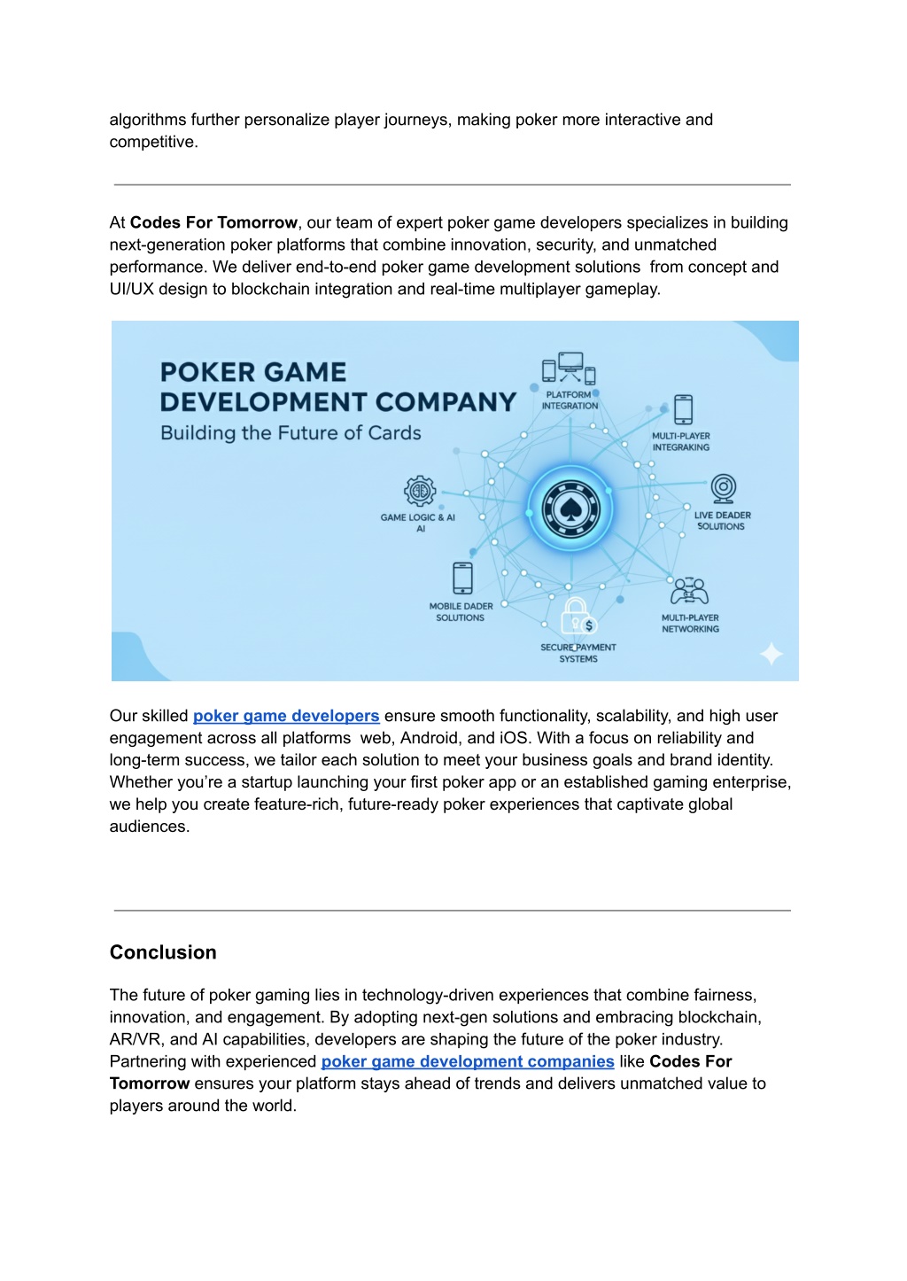 algorithms further personalize player journeys, making poker more interactive and competitive. At Codes For Tomorrow, our team of expert poker game developers specializes in building next-generation poker platforms that combine innovation, security, and unmatched performance. We deliver end-to-end poker game development solutions from concept and UI/UX design to blockchain integration and real-time multiplayer gameplay. Our skilled poker game developers ensure smooth functionality, scalability, and high user engagement across all platforms web, Android, and iOS. With a focus on reliability and long-term success, we tailor each solution to meet your business goals and brand identity. Whether you’re a startup launching your first poker app or an established gaming enterprise, we help you create feature-rich, future-ready poker experiences that captivate global audiences. Conclusion The future of poker gaming lies in technology-driven experiences that combine fairness, innovation, and engagement. By adopting next-gen solutions and embracing blockchain, AR/VR, and AI capabilities, developers are shaping the future of the poker industry. Partnering with experienced poker game development companies like Codes For Tomorrow ensures your platform stays ahead of trends and delivers unmatched value to players around the world.