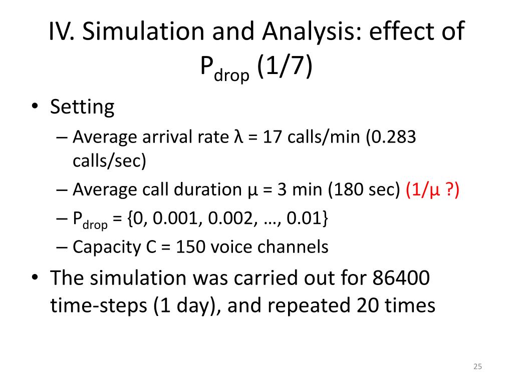 IV. Simulation and Analysis: effect of Pdrop (1/7) • Setting • Average arrival rate λ = 17 calls/min (0.283 calls/sec) • Average call duration μ = 3 min (180 sec) (1/μ ?) • Pdrop = {0, 0.001, 0.002, …, 0.01} • Capacity C = 150 voice channels • The simulation was carried out for 86400 time-steps (1 day), and repeated 20 times