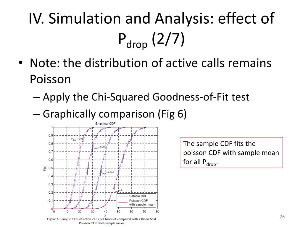 IV. Simulation and Analysis: effect of Pdrop (2/7) • Note: the distribution of active calls remains Poisson • Apply the Chi-Squared Goodness-of-Fit test • Graphically comparison (Fig 6) The sample CDF fits the poisson CDF with sample mean for all Pdrop.