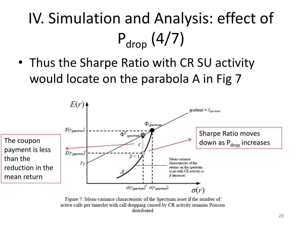 IV. Simulation and Analysis: effect of Pdrop (4/7) • Thus the Sharpe Ratio with CR SU activity would locate on the parabola A in Fig 7 Sharpe Ratio moves down as Pdrop increases The coupon payment is less than the reduction in the mean return