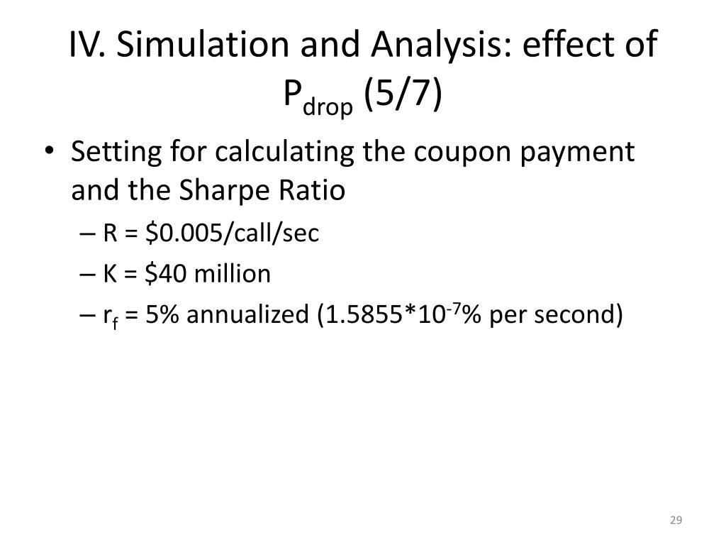 IV. Simulation and Analysis: effect of Pdrop (5/7) • Setting for calculating the coupon payment and the Sharpe Ratio • R = $0.005/call/sec • K = $40 million • rf = 5% annualized (1.5855*10-7% per second)