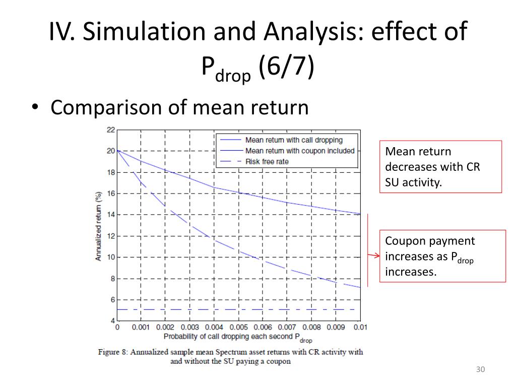 IV. Simulation and Analysis: effect of Pdrop (6/7) • Comparison of mean return Mean return decreases with CR SU activity. Coupon payment increases as Pdrop increases.