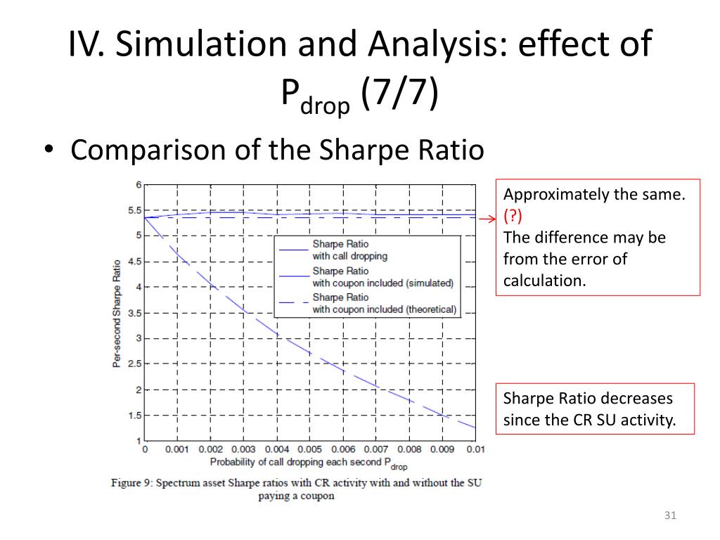 IV. Simulation and Analysis: effect of Pdrop (7/7) • Comparison of the Sharpe Ratio Approximately the same. (?) The difference may be from the error of calculation. Sharpe Ratio decreases since the CR SU activity.