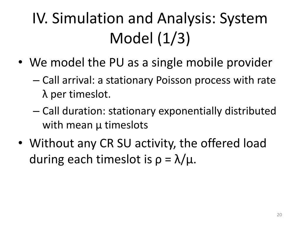 IV. Simulation and Analysis: System Model (1/3) • We model the PU as a single mobile provider • Call arrival: a stationary Poisson process with rate λ per timeslot. • Call duration: stationary exponentially distributed with mean μ timeslots • Without any CR SU activity, the offered load during each timeslot is ρ = λ/μ.