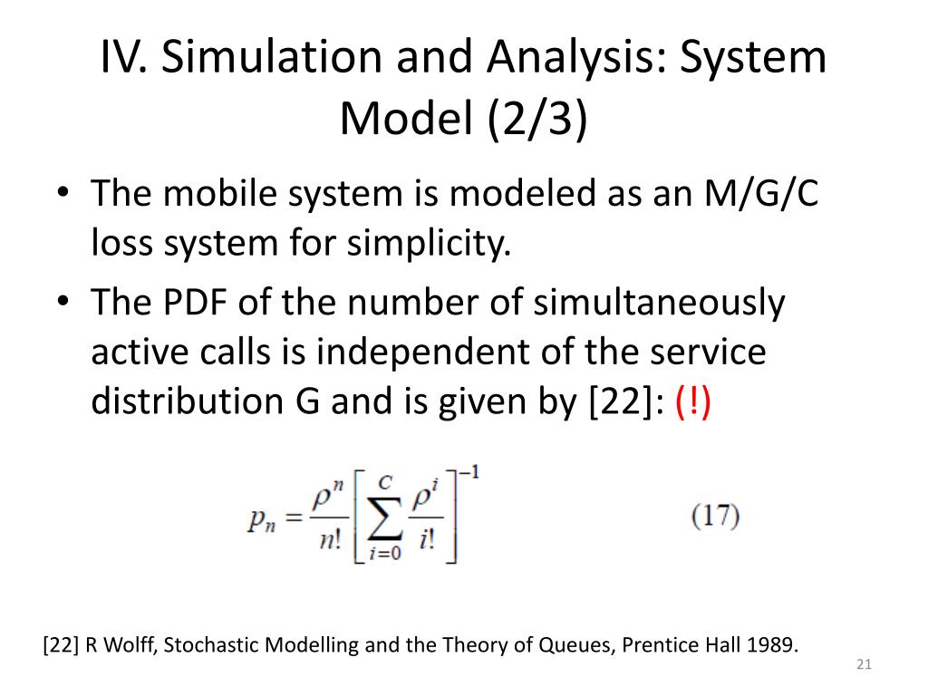 IV. Simulation and Analysis: System Model (2/3) • The mobile system is modeled as an M/G/C loss system for simplicity. • The PDF of the number of simultaneously active calls is independent of the service distribution G and is given by [22]: (!) [22] R Wolff, Stochastic Modelling and the Theory of Queues, Prentice Hall 1989.