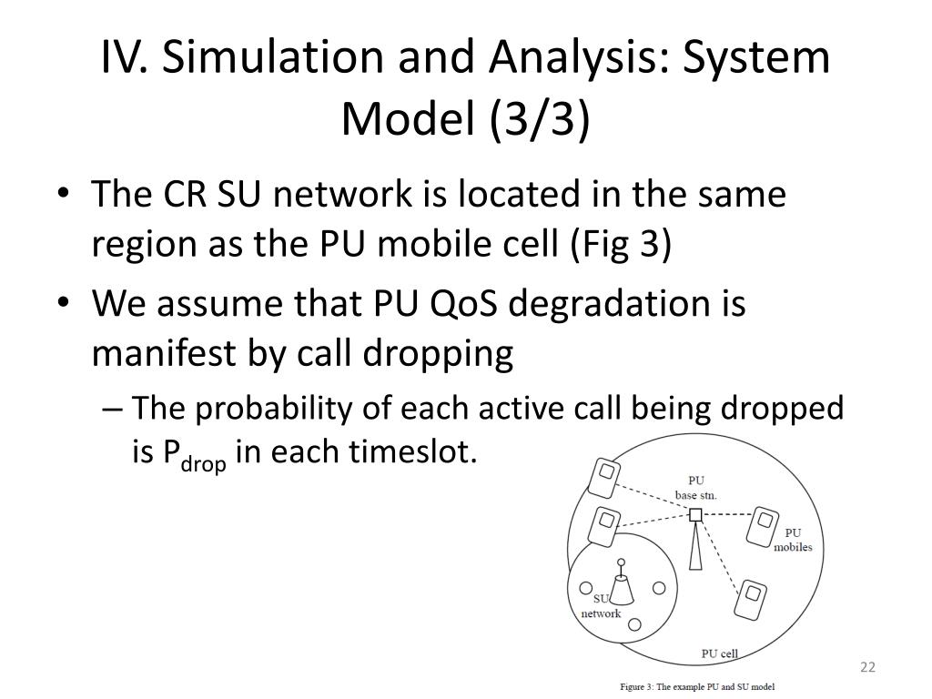 IV. Simulation and Analysis: System Model (3/3) • The CR SU network is located in the same region as the PU mobile cell (Fig 3) • We assume that PU QoS degradation is manifest by call dropping • The probability of each active call being dropped is Pdrop in each timeslot.