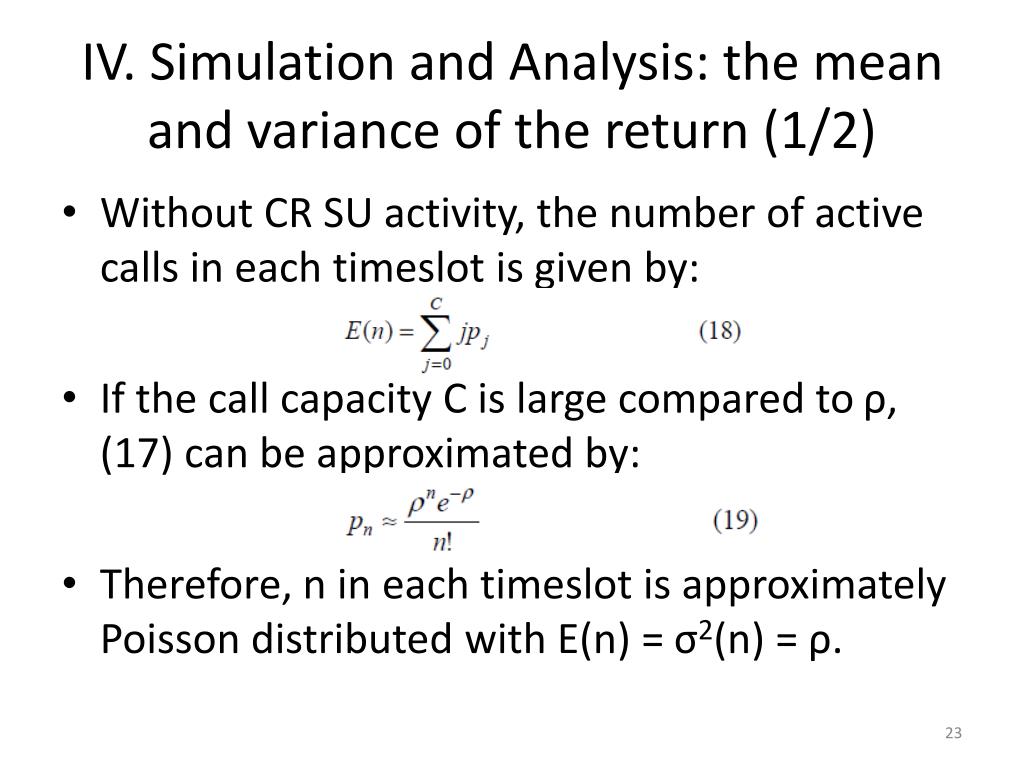 IV. Simulation and Analysis: the mean and variance of the return (1/2) • Without CR SU activity, the number of active calls in each timeslot is given by: • If the call capacity C is large compared to ρ, (17) can be approximated by: • Therefore, n in each timeslot is approximately Poisson distributed with E(n) = σ2(n) = ρ.